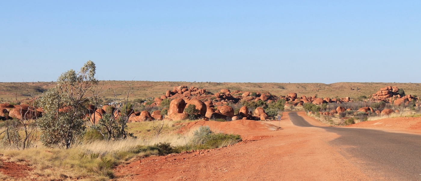 Het is twee dagen later. Gister ben ik van Kakadu national Park naar Maranka gereden, over de Stuart Highway. En nu zit ik opnieuw in de auto voor een volgend traject van Maranka naar devil’s marbles.