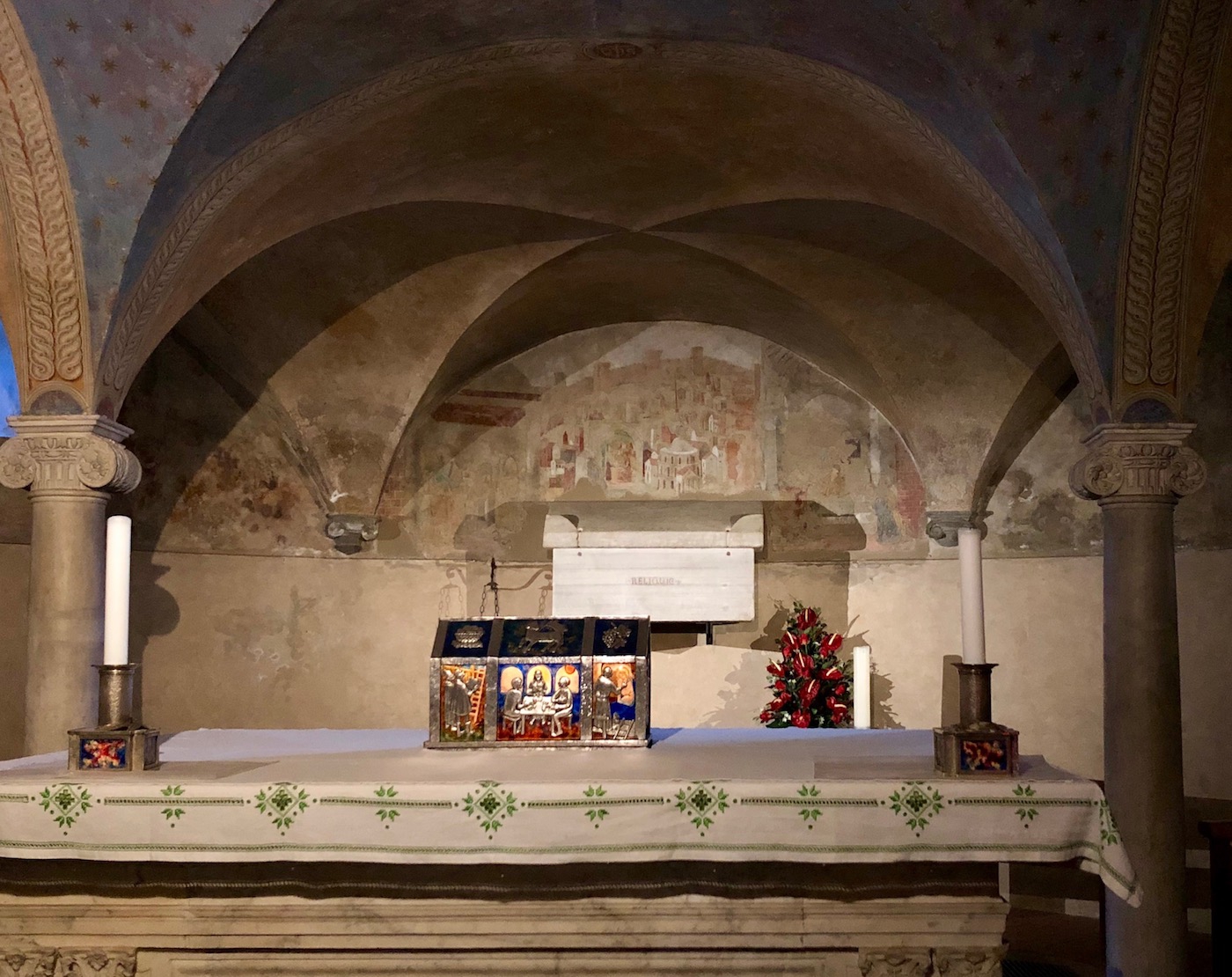 I find a cafe with a view on the hills already open. Then there is a visit to the cathedral, surprisingly sober. Another deep breath is taken in the huge grey, beautiful columns and the vaults in the crypt, above the altar, are exquisite.