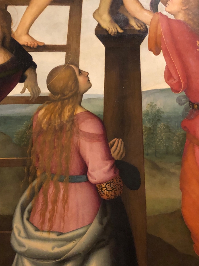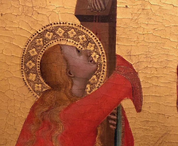 It is interesting to find Mary Magdalene on so many paintings. Often she is portrayed at the cross as in this beautiful detail of a painting by Bernardo Daddi, 1343: