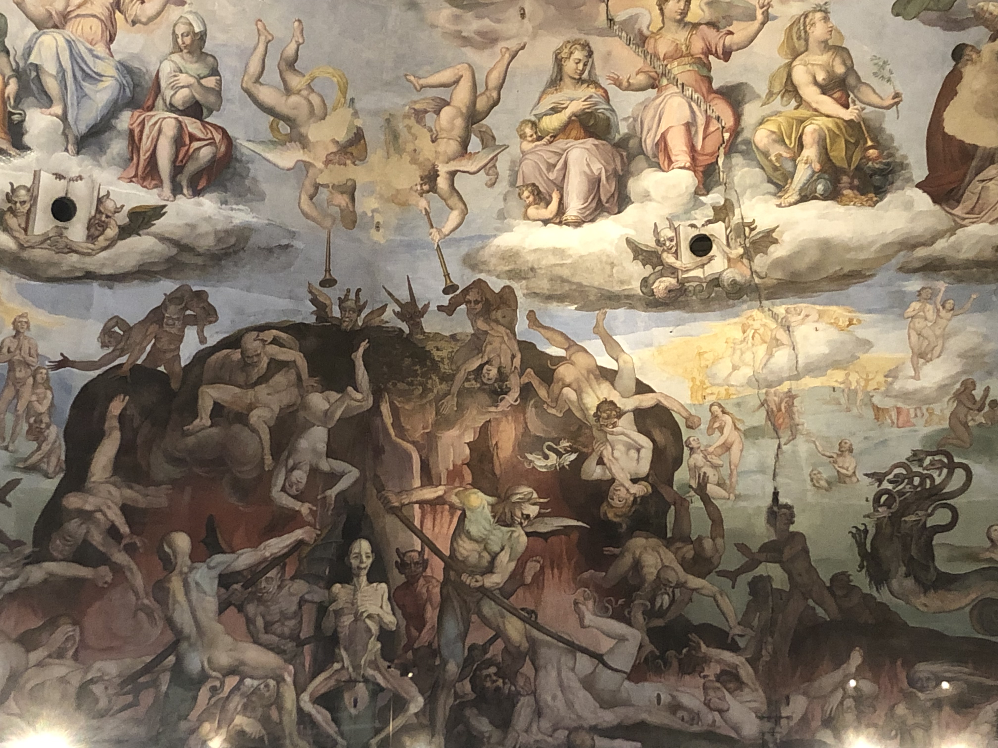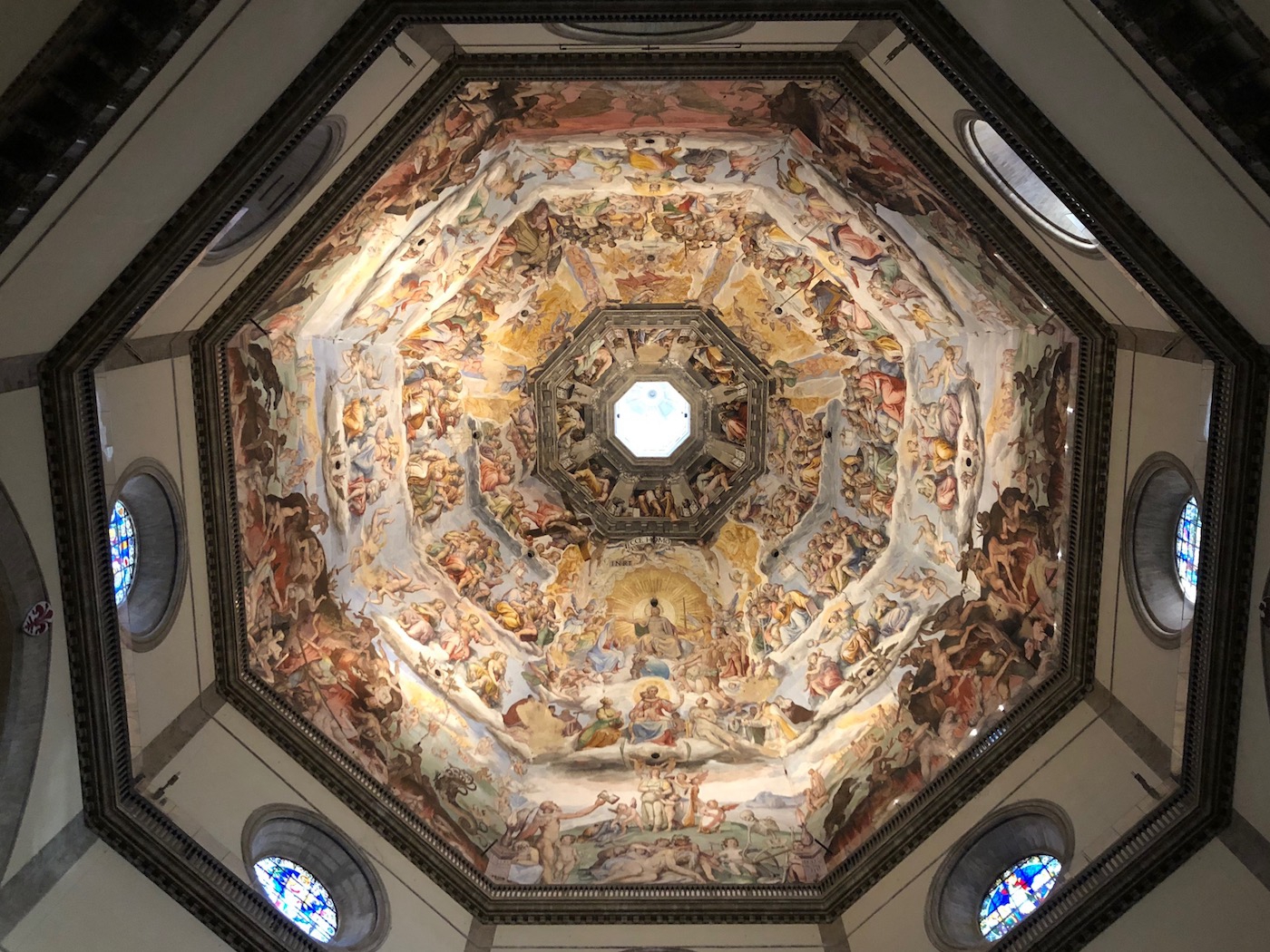 I visited many, many churches. Being inside the Duomo was a very interesting experience. In contrary to many of the other churches it is very sober, but standing in front under the huge Dome I experience a spaciousness that I have never experienced before, not in the desert or in the mountains. It is an amazing achievement to build this dome and it seems Brunelesschi knew what he was doing. From the inside of the church, looking up, you see the whole painted dome, made by many artists.