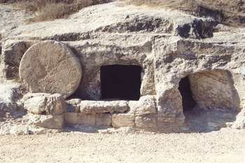 Aangekomen bij het graf ziet ze dat de zware steen is weggerold, het graf is leeg!