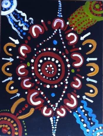 Een Aboriginal beeldend kunstenaar geeft de workshop, samen met een jonge Australische vrouw die voor de vertaling zorgt. De schilderingen van de Aboriginals en hun tekeningen in het zand lijken symbolen maar het zijn de sporen die afdrukken in het zand achterlaten. Mannen zittend op het zand met naast hen hun pijlen en vrouwen met graafstok en kom. Dieren worden aangegeven door de sporen die hun poten achterlaten en het landschap wordt weergegeven door de bekende ronde dots in verschillende kleuren. Een heilige of belangrijke plek is bestaat uit een serie concentrische cirkels en de weg van de ene naar de andere plek door een paar evenwijdige lijnen. Zo kun je je eigen levensverhaal op papier en op canvas uitdrukken.