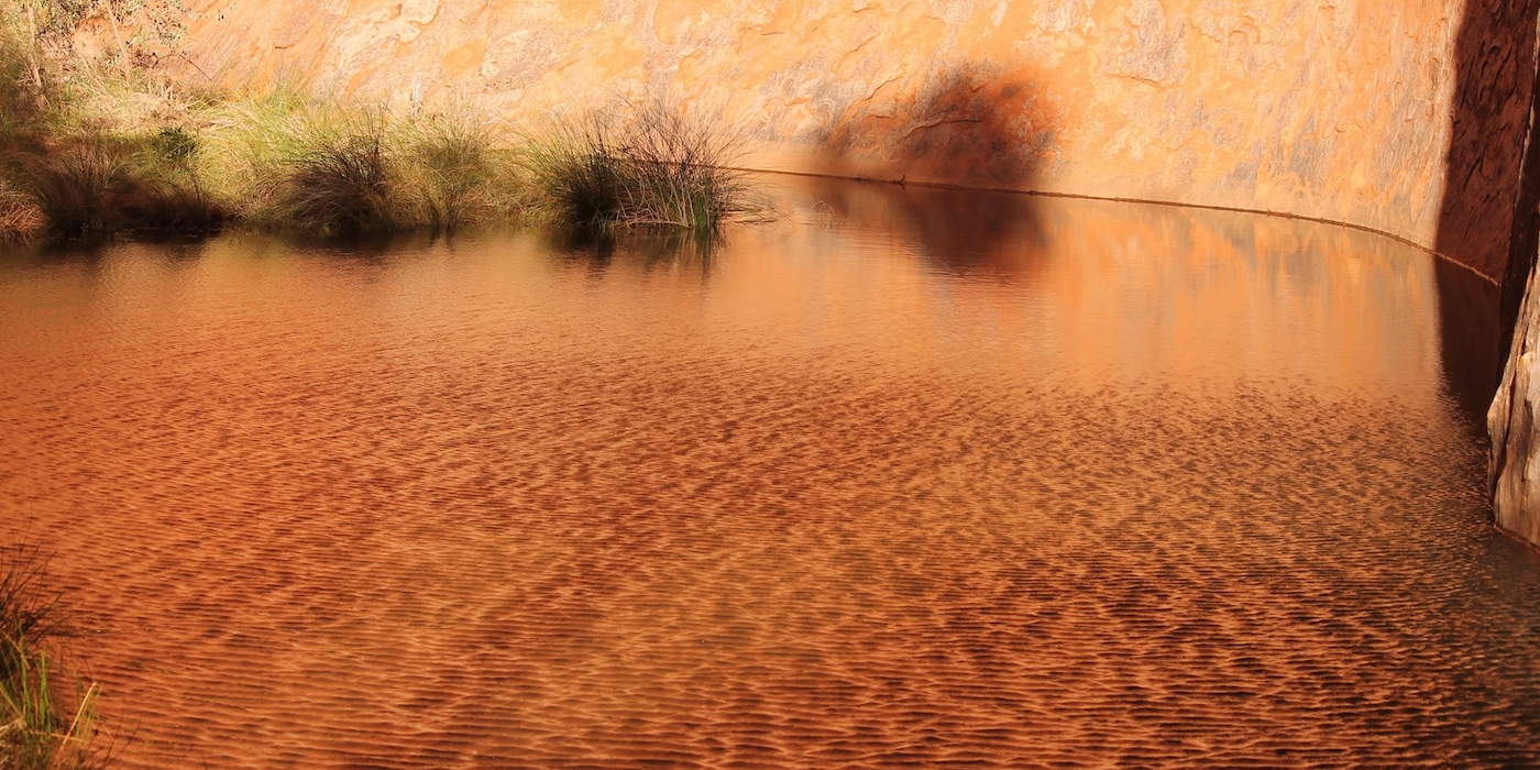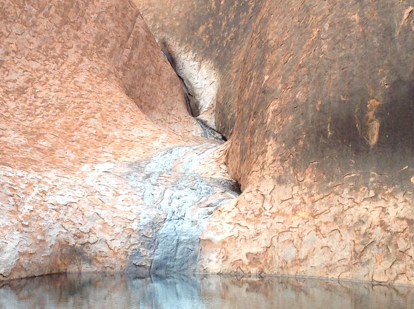 Langzaam loop ik van Kuniya car park naar de ‘Mutitulu waterhole’. Stap over de oranjekleurige plassen op het pad. Het is voor het eerst dat ik de immens grote rots van dichtbij nader. De rots heeft kleine donkere vlekken op haar zacht lijkende ondergrond. Haar wanden stijgen hoog boven mij uit. Nietig ben ik, nietig. En ik voel me omhuld, gedragen.