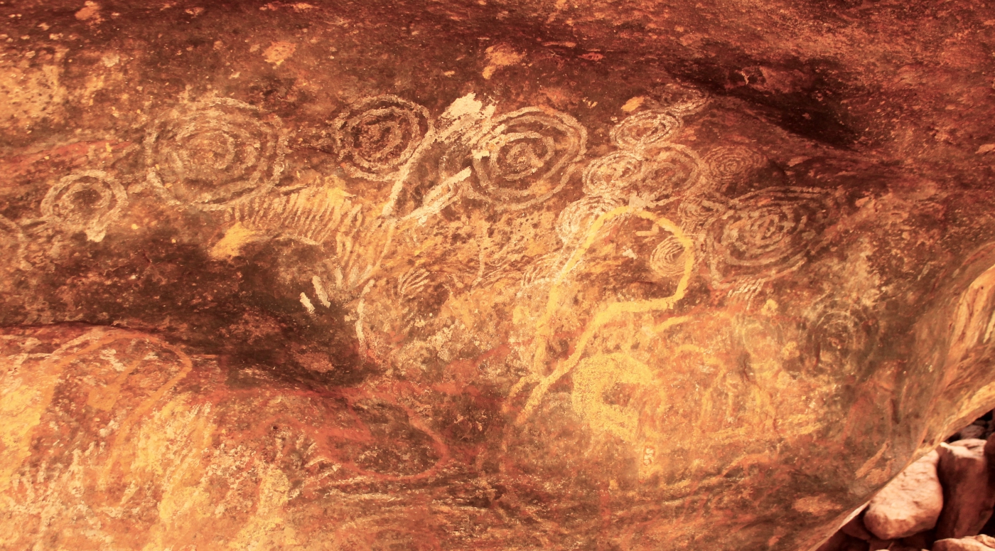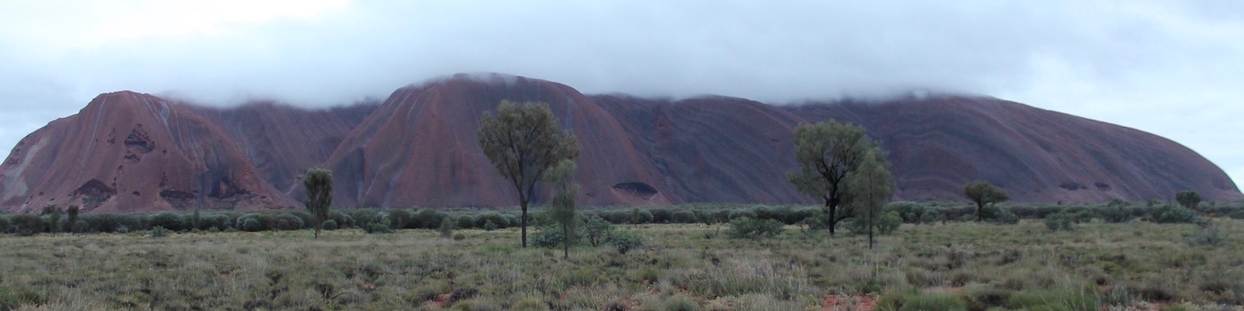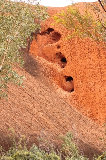 We staan stil bij de immense hoogte van de rots, bij haar vele plooien die vaak yoni-achtige, vrouwelijke vormen laten zien. We lopen de grotten in die laag bij de grond toegankelijk zijn en kijken omhoog naar de vele grotten die hoog in de wand zijn ontstaan. Sommigen hebben een plaats gekregen in de mythes, zoals deze openingen die de transformatie van python naar vrouw verbeeldt. Rondom deze rots hebben Aboriginals geleefd, hebben ze gejaagd en hun kinderen geleerd over het land en de jacht. Hier hebben ze hun ceremonies gehouden.