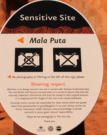 Langs de basis van de rock staan op veel plaatsen een verzoek om niet te fotograferen. Het zijn heilige plaatsen voor de rituelen van mannen of vrouwen. Deze plekken mogen alleen door ons, bezoekers, direct worden ervaren. Afbeeldingen van deze plekken mogen niet zomaar de wereld rond worden gestuurd.
